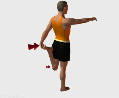 Ejercicio 5.- Cuádriceps, Para estirar los cuádriceps y la rodilla, nos sujetaremos la parte posterior de un pie con la mano, tirando de él lentamente hacia las nalgas. 30 segundos.